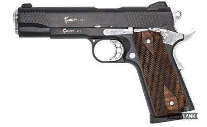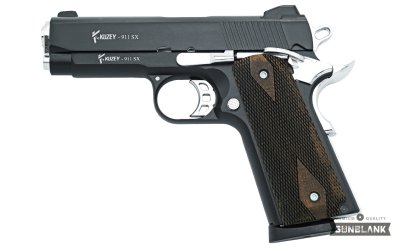 ปืนแบลงค์กันจำลอง 911 รุ่นใหม่จากตุรกี ดำด้านผสมชิ้นเงิน ลำกล้อง 5 นิ้ว ไม่มีเครื่องหมายการค้าปลอมบนสไลด์หรือโครงปืน เราจำหน่ายภายใต้เครื่องหมายการค้าดั้งเดิมของ Kuzey (ระบบนิรภัยคันโยกใช้งานไม่ได้)