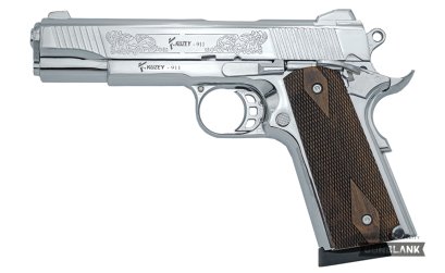 ปืนแบลงค์กัน 911 เงินเงาสลักลายจากตุรกี ลำกล้อง 5 นิ้ว ไม่มีเครื่องหมายการค้าปลอมบนสไลด์หรือโครงปืน เราจำหน่ายในฐานะเครื่องหมายการค้าดั้งเดิมของ Kuzey (ระบบนิรภัยคันโยกใช้งานไม่ได้)